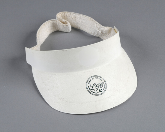 White plastic visor with white sweatband that is attached with velcro. Hat is printed in green on the front center with, "RING OF GREEN/ LGC". The words are inside two concentric circles and there is a delicate branch with three leaves at the bottom.