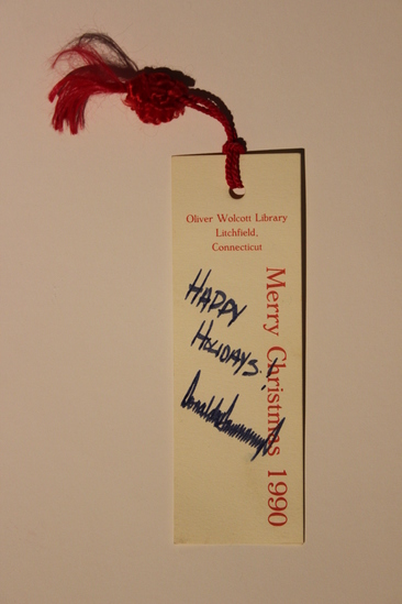 Rectangular paper ornament, white with red text and red cord tied into loop at top. Created by the Oliver Wolcott Library of Litchfield, CT for their 1990 holiday fundraiser. Text reads "Oliver Wolcott Library/Litchfield/Connecticut/Merry Christmas 1990." Ornament is signed by Donald Trump in blue ink, "Happy Holidays! Donald Trump."