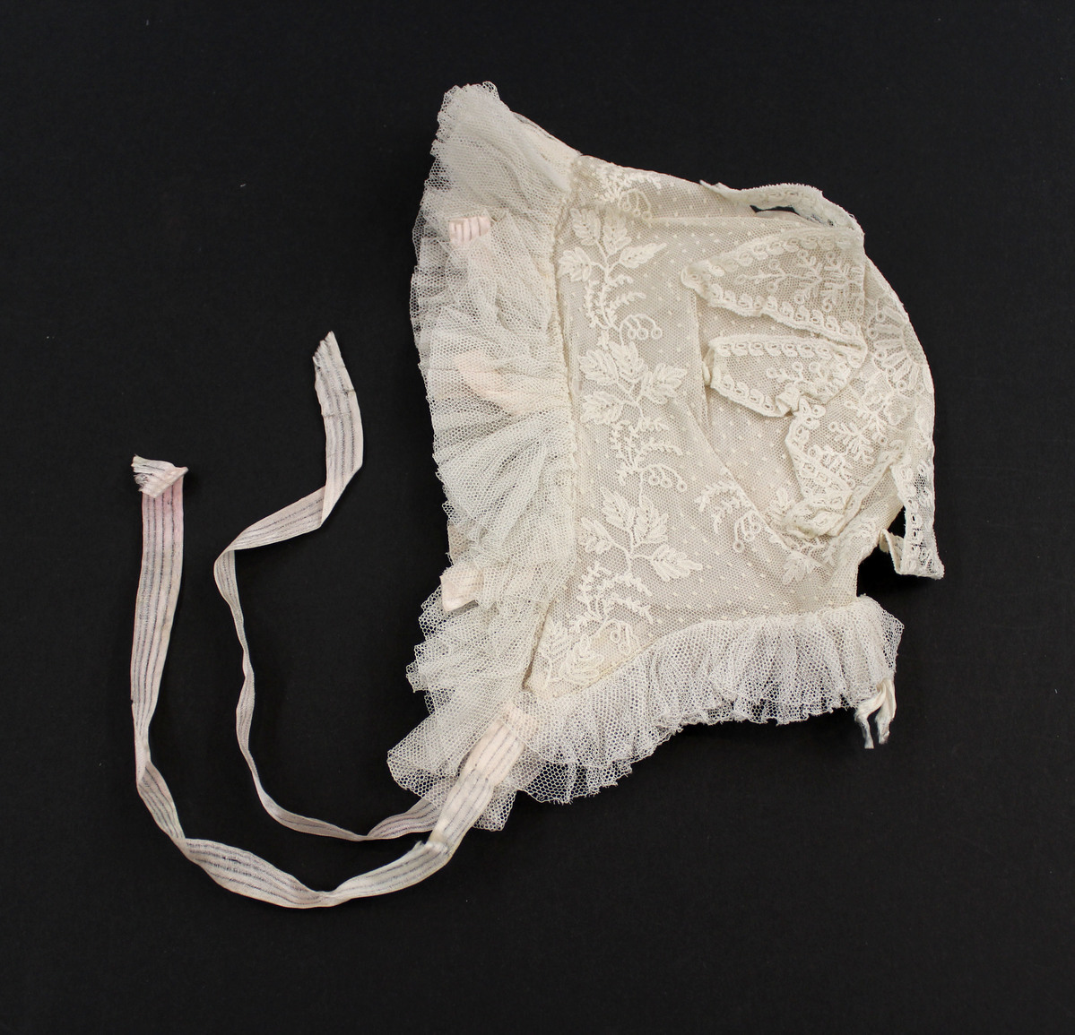 Off-white cotton embroidered net child's bonnet; dots and floral embroidery; net ruffle at front and neck; multi-pointed star attached at crown; pink silk ribbon ties and loops in front and in ruffle; pink silk bow at center back; off-white silk lining