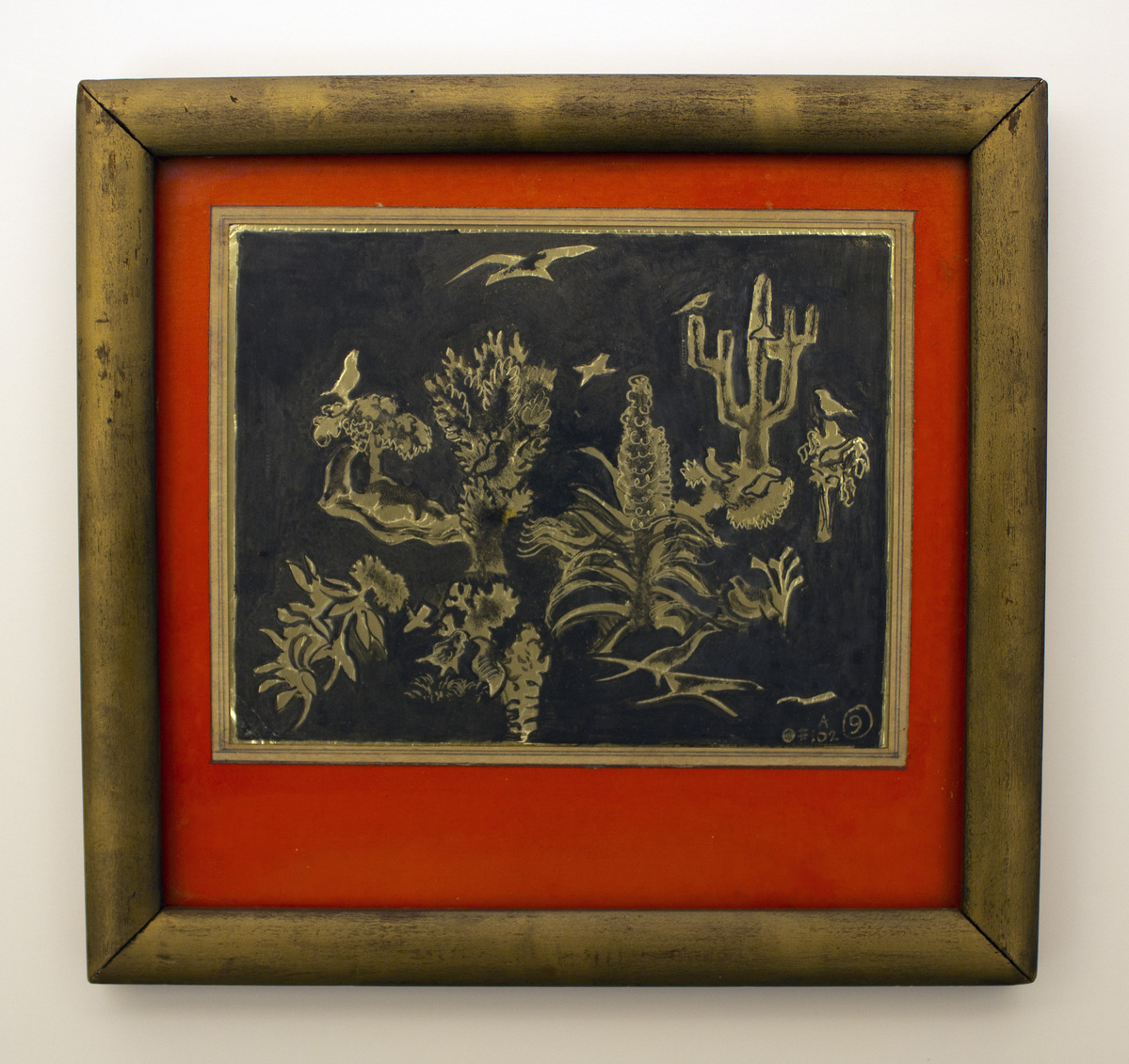 Sketch of study for a proposed design by Austin Purves of East Litchfield, Connecticut. Black ink or think black paint on gold foil. Shapes formed by a mix of negative space (gold foil without layer of black pigment) and scratched/incised lines, with the addition of thinner black pigment for details inside gold shapes. The scene shows an abstract landscape with trees, shrubs (possibly a cactus), and multiple types of birds. Signed in lower-right, "A/#F102/9." Work is framed under glass with burnt orange mat with pencil-decorated interior edge. Simple wood frame, painted in matte gold. In pencil on reverse, "PRELIMINARY SKETCH FOR/PROPOSED SMOKING PANELS/FOR S.S. AMERICA/U.S. LINES/AUSTIN PURVES 1940."
