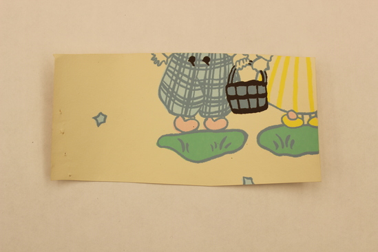 Rectangular wallpaper sample made from vinyl. Lower half of the Jack and Jill motif seen on 2004-25-5A. Jack is wearing blue pants with crosshatching in a darker blue, black buttons, and pink shoes; Jill is wearing a white dress with yellow vertical lines and pink and yellow shoes. They are holding a blue basket with black accents. Both figures are standing on green patches of grass.