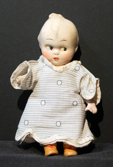 Small bisque Kewpie doll. Head molded with a wisp of hair on top. Eyes, lips, and eyebrows painted on. Doll also has molded feet with painted on shoes and socks. Doll dressed in a cotton dress with grey and white stripes and polka dots. Doll wears red cotton short under dress.