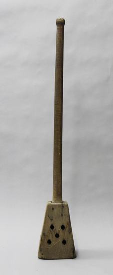 Wooden plunger. Thick rod handle. Four sided base with holes in each side.