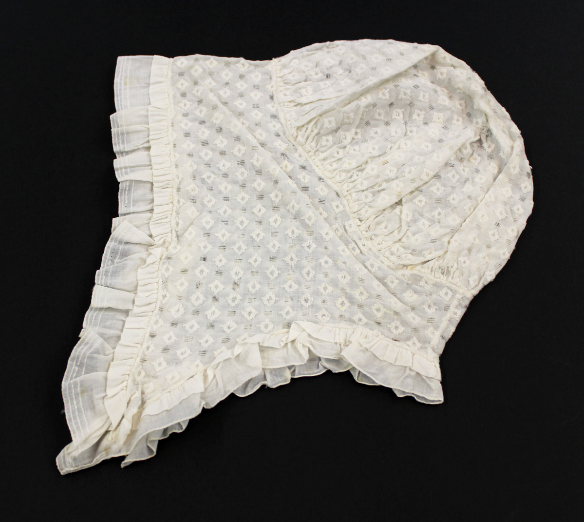 Off-white patterned cotton child;s bonnet; gathered back section; double ruffle around front and neck; elongated at sides; center back monogram stitched in tan thread: "S-Y"