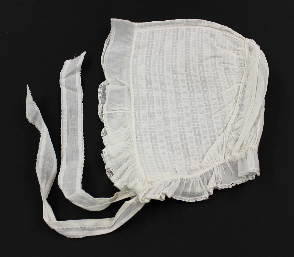 White sheer checked child's bonnet; embroidered insertion at top and at back gathered section; double piping along crown; sheer ruffle with lace along front; neck ruffle with lace; fabric ties