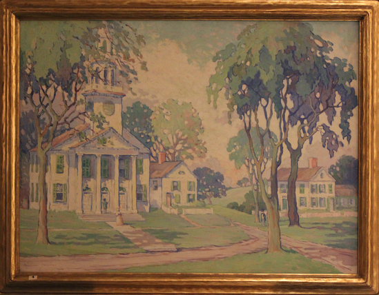 This view of Litchfield in the early nineteenth century was a favorite of Adelaide Deming's. Three examples of the scene are in the collection of the Litchfield Historical Society, including an over-mantel painting (1987-01-0) that hung in the Julius Deming house on North Street and a study for the same (2019-105-2). It is possible that this painting is either a second study or version done for Deming's personal collection. While the painting was executed around 1920, it does not depict Litchfield as it appeared at the time. The artist altered the placement of the buildings to suit her creative vision.