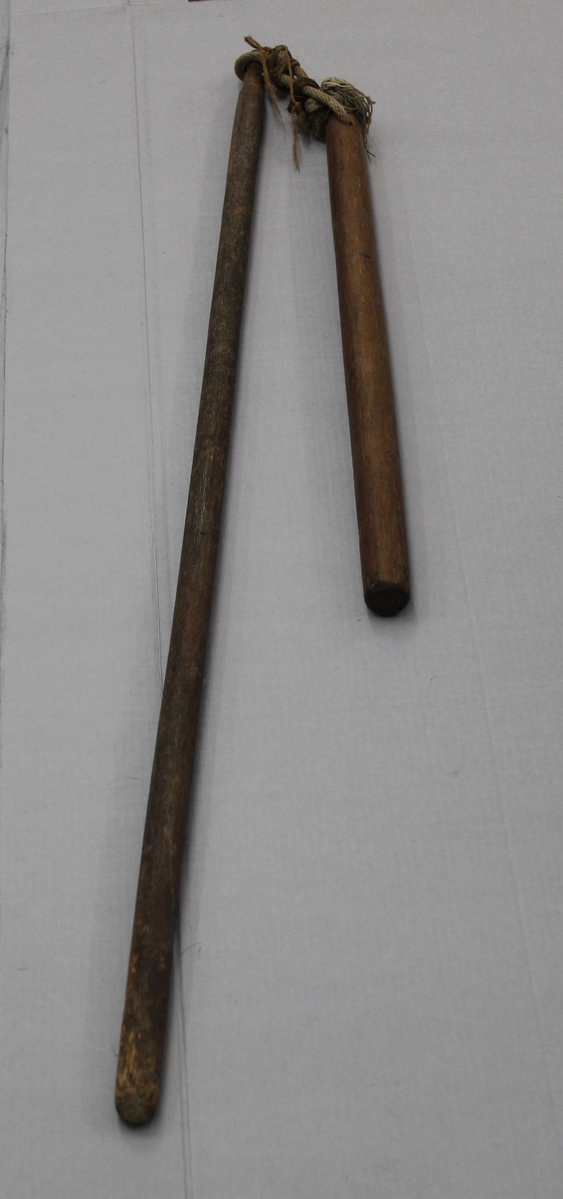 Two piece flail, consisting of two wooden rods, one longer than the other. Both have holes at top and are loosely joined together by thick rope.