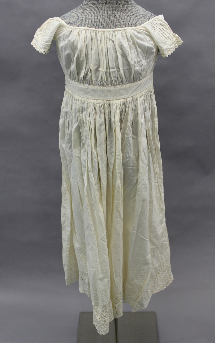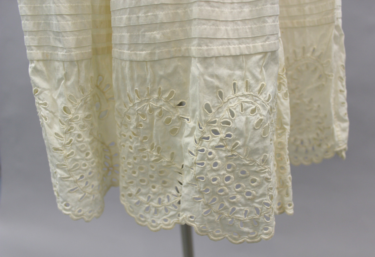 White cotton long white baby dress; scoop neckline with drawstrings; gathered bodice; short sleeves with tucks and Broderie Anglaise embroidery