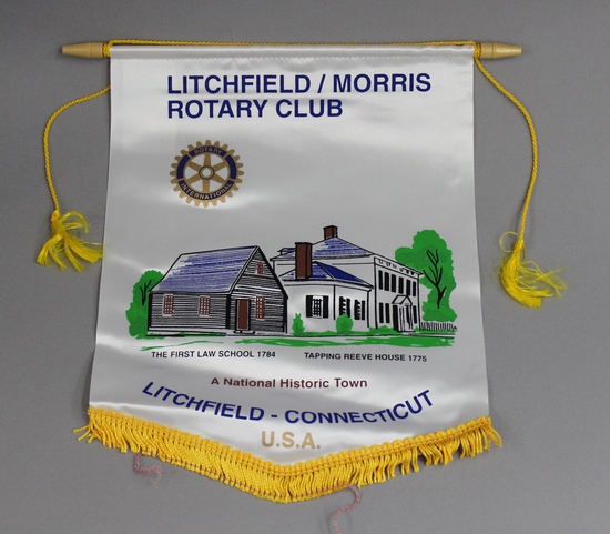 Small banner for the Litchfield/Morris Rotary Club. Banner shows the Rotary International Logo with a view of the Tapping Reeve House and Law School, against a white background. Text "Litchfield/Morris Rotary Club/The First Law School 1784/Tapping Reeve House 1775/A National Historic Town/Litchfield-Connecticut/U.S.A." Banner has a 1" gold fringe along bottom and gold braided string with tassels along top. Banner is suspended from 9.25" wooden dowel with carved, gold-painted caps.