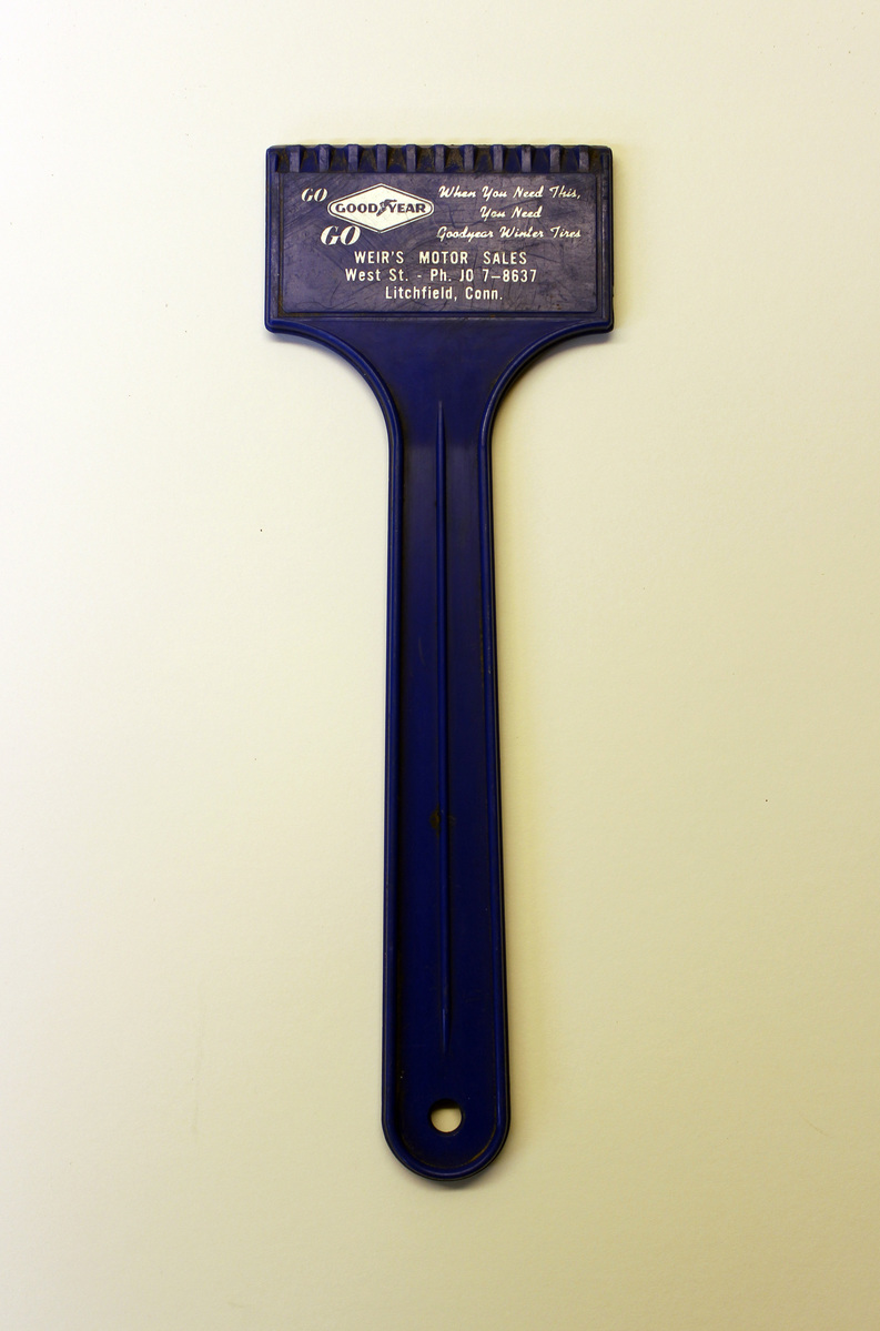 Large plastic scraper (ice scraper), produced as a promotional item for Weir's Motor Sales. Molded blue plastic with straight handle with rounded end, tapering slightly to a rounded neck. Square blade. Handle has a small hole at the end. Blade has a number of plastic teeth for scraping. Printed white lettering on blade, "When You Need This/You Need/Goodyear Winter Tires/WEIR'S MOTOR SALES/West St. - Ph. JO 7-8637/Litchfield Conn." White "Goodyear" logo at top left.