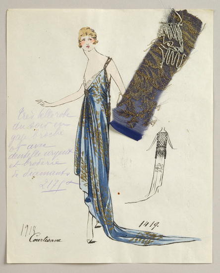 Lithograph and watercolor on paper fashion design. Evening dress in gold brocaded gauze with silver lace and embroidery of diamonds. Fabric samples accompany rendering.