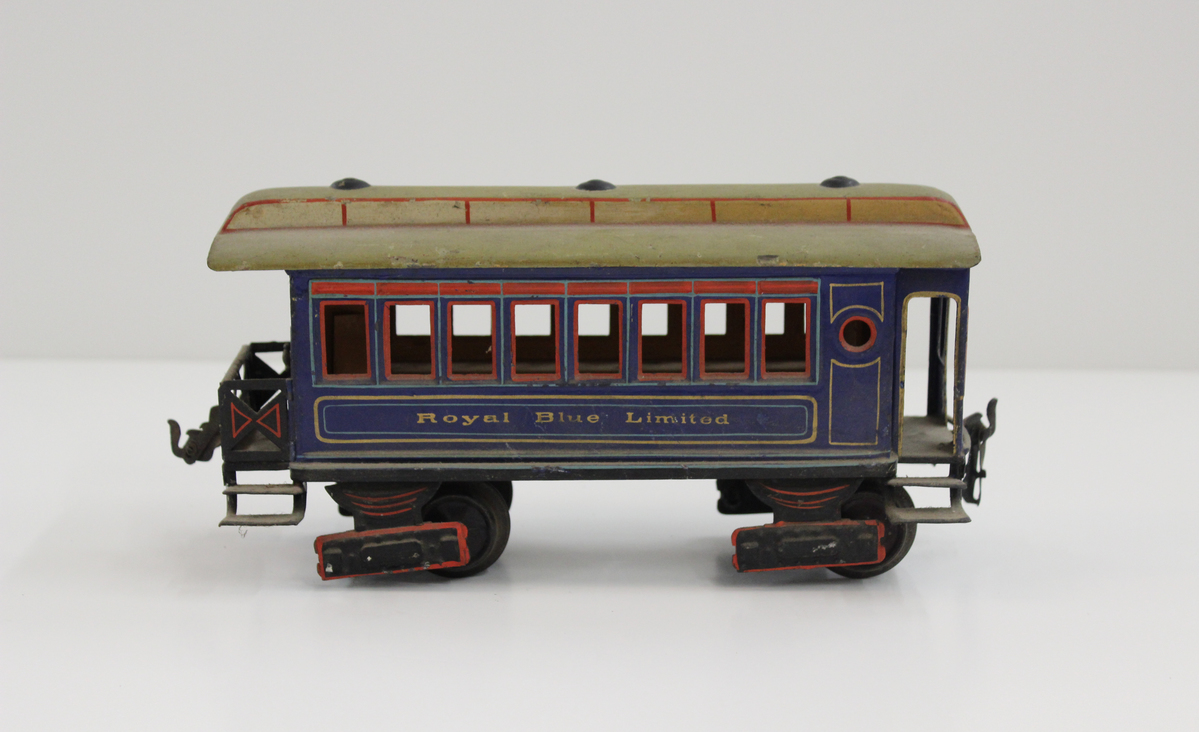 Early 20th-century tinplate passenger car, possibly made by Märklin. Rectangular car with eight square windows on each side, open exit at the front, hinged door at the rear, and open deck on the back complete with hinged gates. Car has a hinged top to reveal interior, which has two parallel benches running underneath the windows and two small, square compartments at opposite corners, each having a fixed door and small circular window. The benches have raised spikes on them, possibly for attaching passengers. The exterior of the car is painted blue with red and yellow details. Yellow lettering on each side reads "Royal Blue Limited." Metal steps and hookups for other cars at each end. Marked on bottom "Made in Germany" in red.