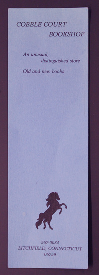 Rectangular bookmark made of blue paper. "COBBLE COURT/ BOOKSHOP/ An Unusual,/ distinguished store/ old and new books" printed in black at top. An image of a horse reared on its hind legs with "567-0084/ LITCHFIELD, CONNECTICUT/ 06759" below horse printed in black at bottom of bookmark.