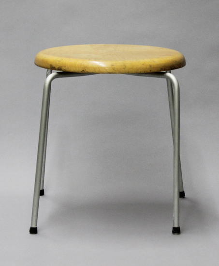 Small stool. Round wooden seat with four metal legs. Rubber stoppers on foot of each leg.