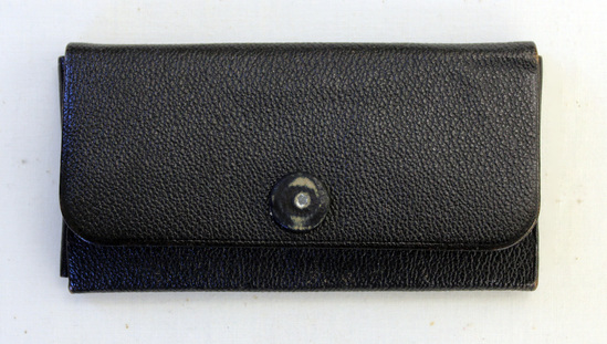 Gold colored Masonic medal with pin closure on back. Pin constructed in three sections. Sections connected by metal loops and chain. Top oblong bar stamped with "GRAND LODGE" in blue enamel. Round seal hangs below. Second section double bar with 'CONNECTICUT / 1909" stamped in blue enamel. Third section a large round Masonic seal with a compass, ruler and triangle backed in purple. Black leather case for the medal. Case folds from all four sides with a snap closure on front. Central inner panel covered in blue velvet. Top and bottom flaps covered with blue silk on inside. 'L.F. GARDELLA / MFG JEWELER / AND EMBLEM MAKER / 40 ASYLUM ST. / HARTFORD, CONN." stamped on inside of flap.