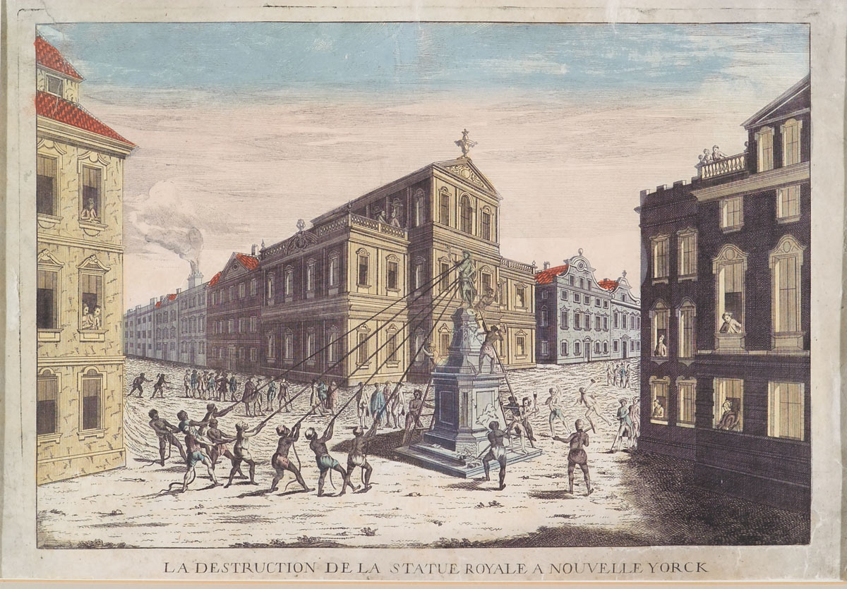 German or French engraving with hand coloring, entitled at the bottom, "La Destruction de la Statue Royale a Nouvelle Yorck." Image of a city square with European style architecture. In the center is a tall pediment with a statue of a standing male in the style of a Roman emperor, holding a scepter in his right hand. The statue is being pulled down using ropes, ladders, and pickaxes by a group of men, predominantly enslaved or free Africans (depicted in short pants and turbans) and a small number of white men. Onlookers are gathering to the left of the statue and in nearby windows and balconies. A group of soldiers can be seen in the distance to the right of the statue. Framed under glass.