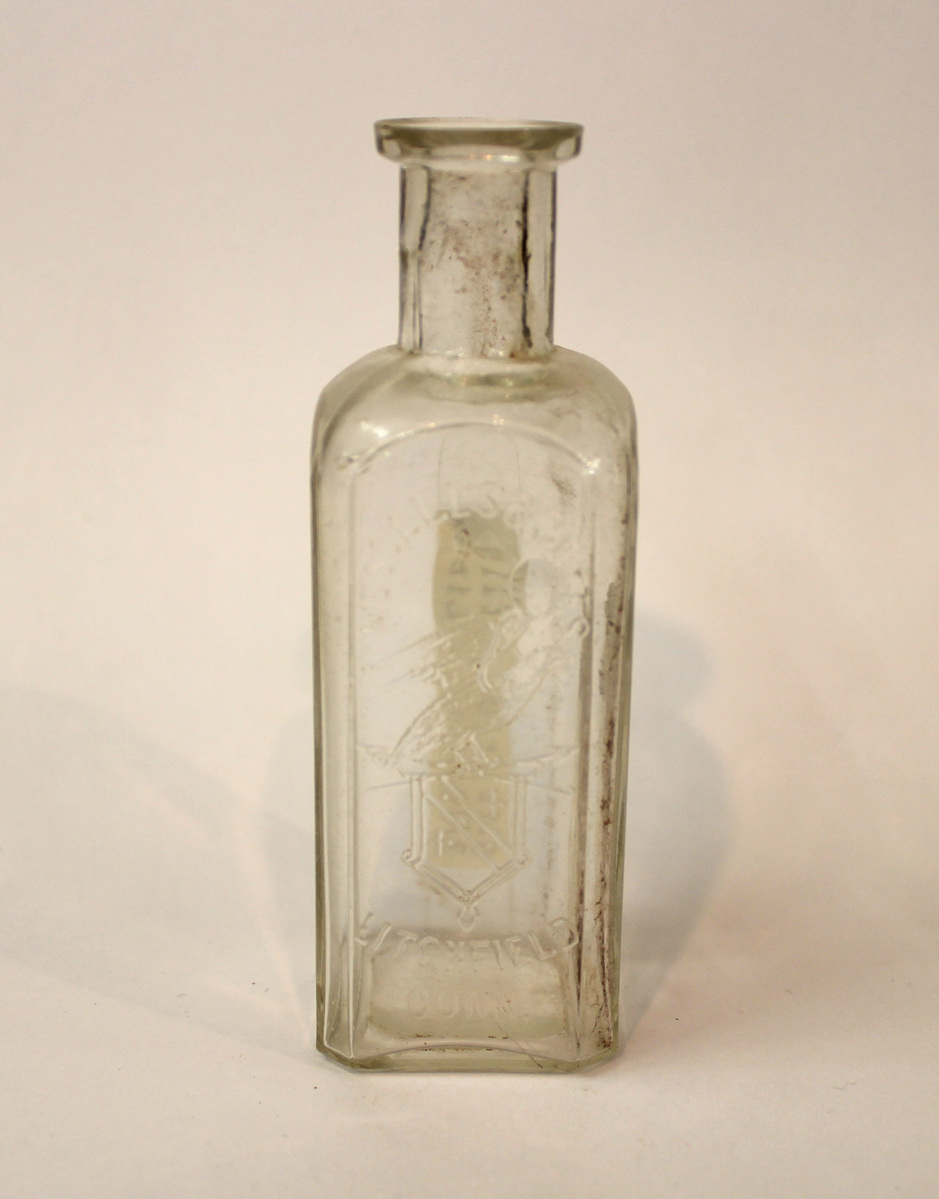Pressed glass medicine bottle, clear glass, squared shoulders with beveled corners. 1" neck with flat rim; mold lines visible. Embossed lettering on front, "WESSELLS & GATES/LITCHFIELD, CONN." with emblem of eagle standing on a shield. Embossed lettering on bottom, "W.T. & Co./H." Paper label on reverse, "gift of Ad. Lillis, 3/19/93 fd bk Lit Bk."
