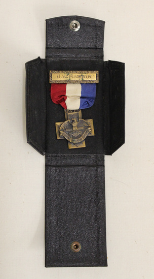 Black rectangular leather case with sides that hold in and snap closure. Inside is a medal in three parts: 1st part - brass name plate with narrow decoration corder - "H.W. Marrin"; 2nd part - red, white and blue ribbed silk ribbon gathered into 3rd part; 3rd part - a brass greek cross with an eagle with wings spread, in its talons are arrows and shield of the U.S.A, a ribbon overlaps the shield with the words, "UNITED STATES FORCES." On the verso of the cross it states that the medal as presented by the people of Montclair, NJ in grateful recognition of patriotic service during the "World War."