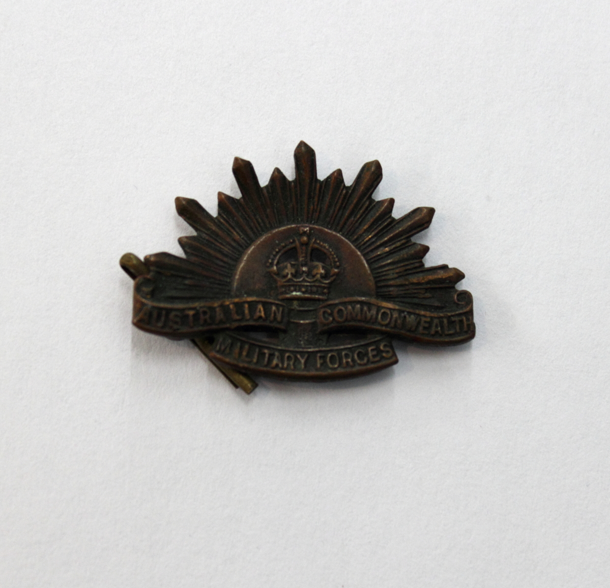 Bronze semicircular badge. In center, relief of jeweled crown with holes between arch and base. Crown is set in front of a sun, with rays of alternating lengths spreading out at a 180 degree angle. Below are three separated scrolls, two that are level to the left and right and one in the center below them. The top right scroll has lettering "AUSTRALIAN", top right "COMMONWEALTH" and bottom "MILITARY FORCES". "Rising Sun" badge, Australian Army.