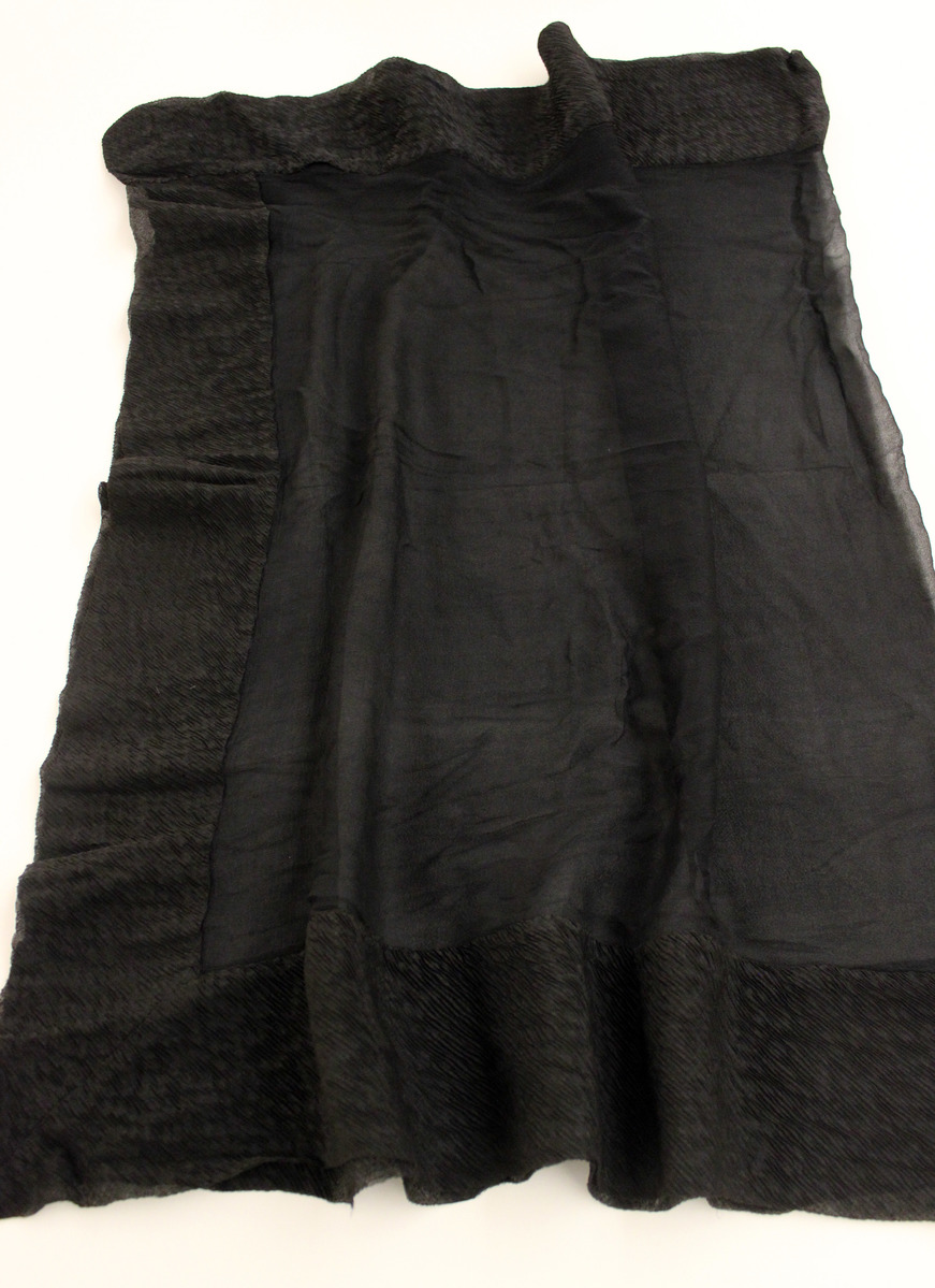 Black sheer silk mourning veil. Rectangular with crepe fabric edges.