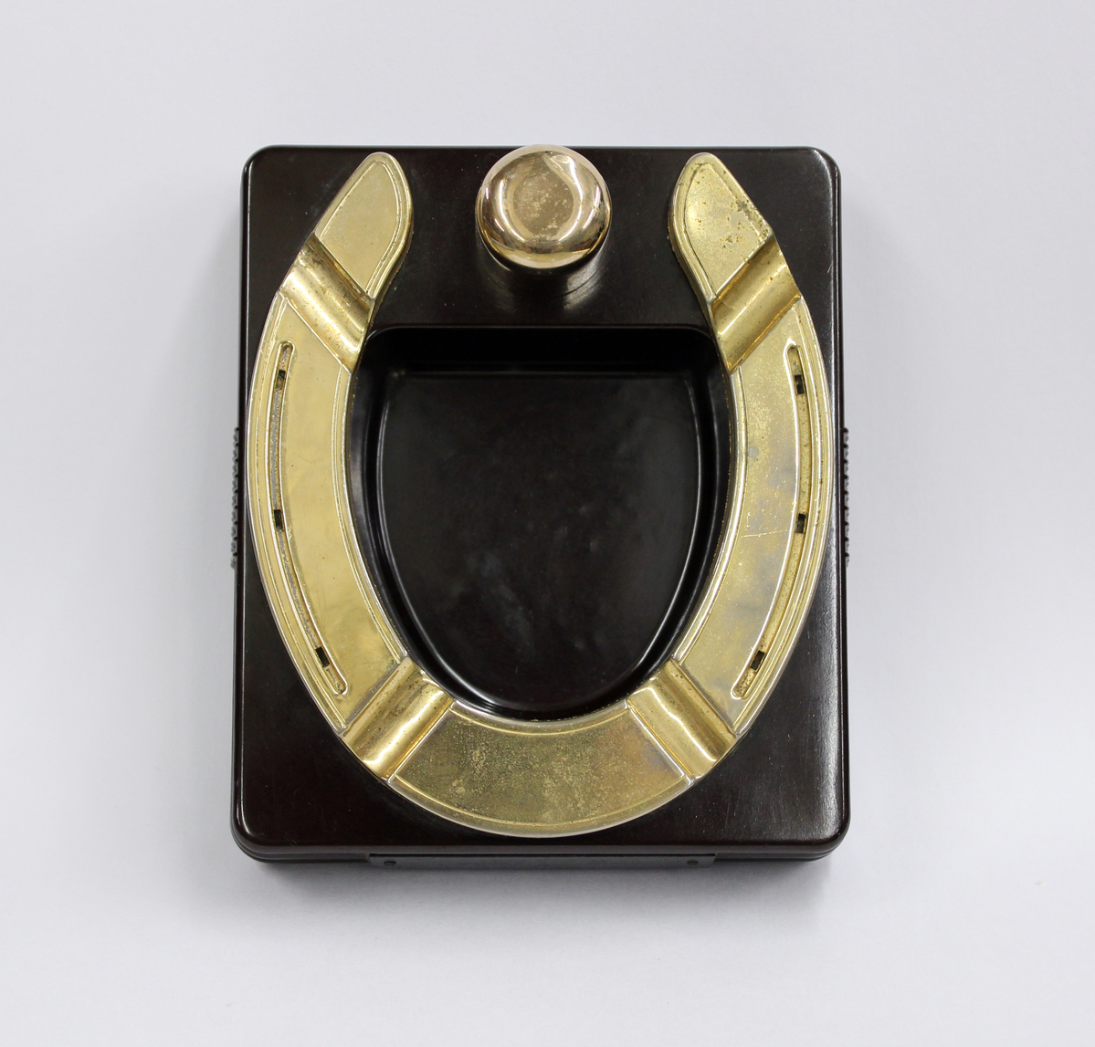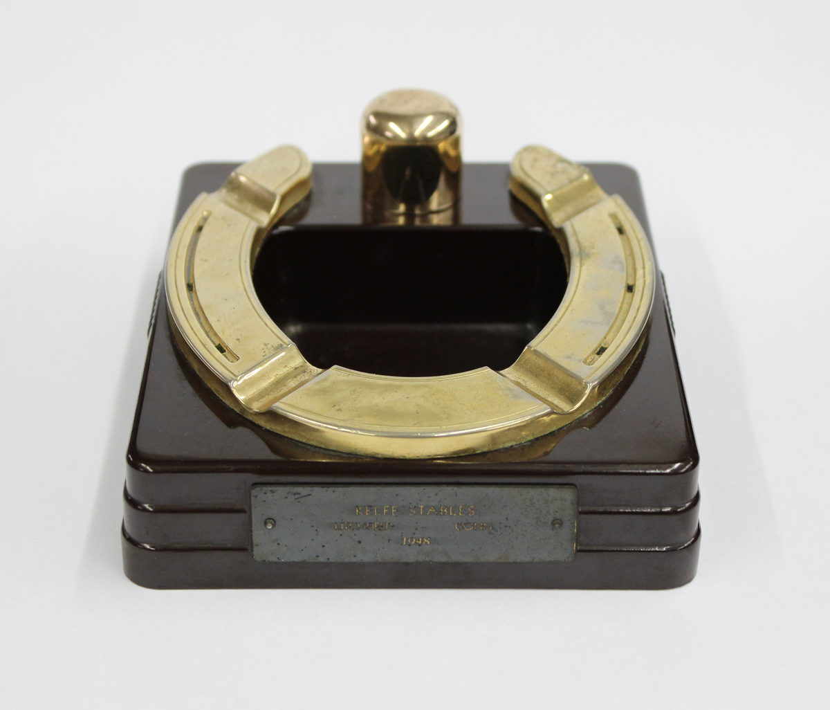 Brown and gold souvenir ashtray with lighter. Rectangular tray of brown Bakelite with gold metal horseshoe on top, with gold metal lighter insert. Metal plaque on the front with engraved lettering, "KEEFE STABLES/LITCHFIELD CONN/1948."