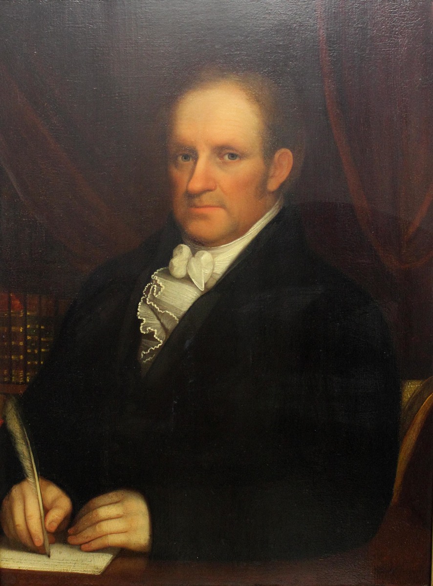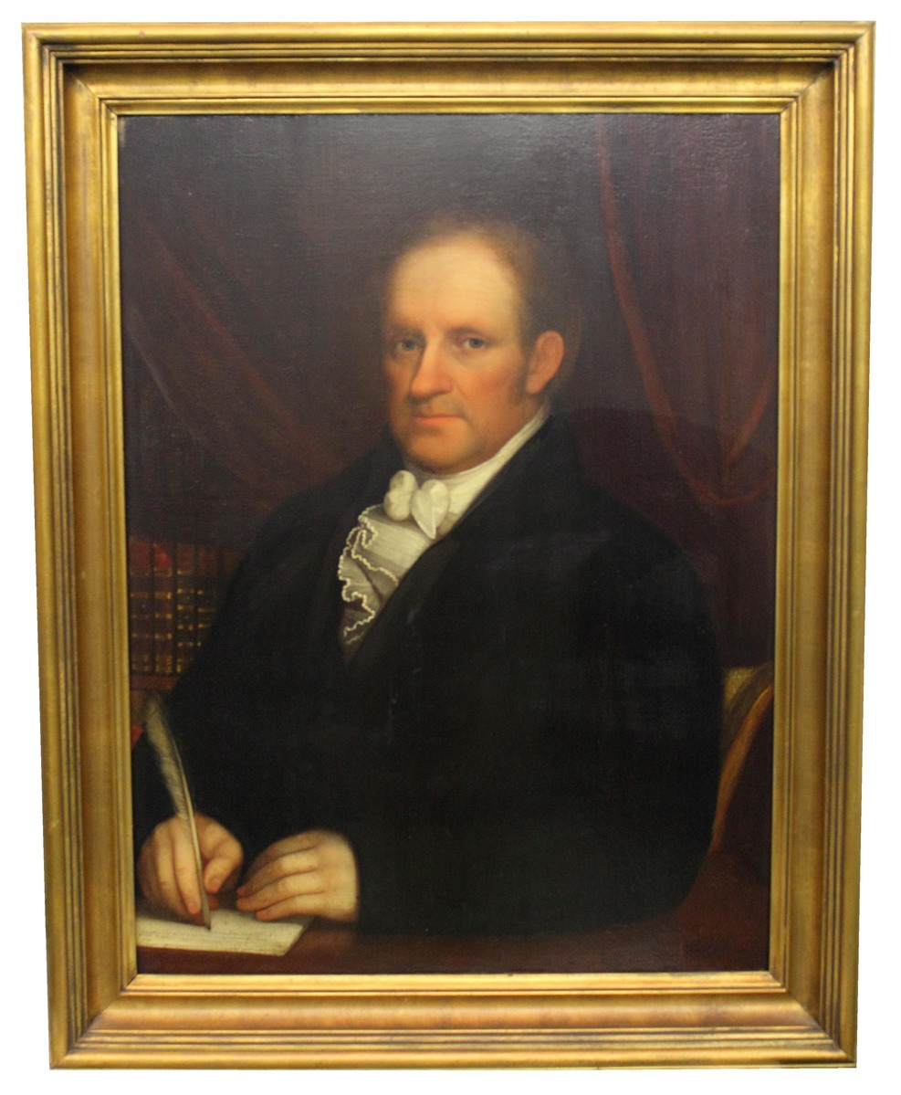 Oil on wood board portrait of John Russel Landon (1765-1851). Half-length portrait of a middle-aged man, seated in upholstered chair at a desk or table, against a dark background with chestnut-colored drapery. Man wears a dark suit with narrow lapels and a white, ruffled necktie. The man has gray eyes and thinning, light brown hair; shadow of facial hair on upper lip and chin, with sideburns extending just below ear. The man holds a writing quill in his right hand and a piece of paper under his left, with several lines of illegible writing. Multiple leather-bound volumes are visible in the background behind his right shoulder. The man is facing slightly left. The portrait board is cradled and set in reproduction giltwood frame.