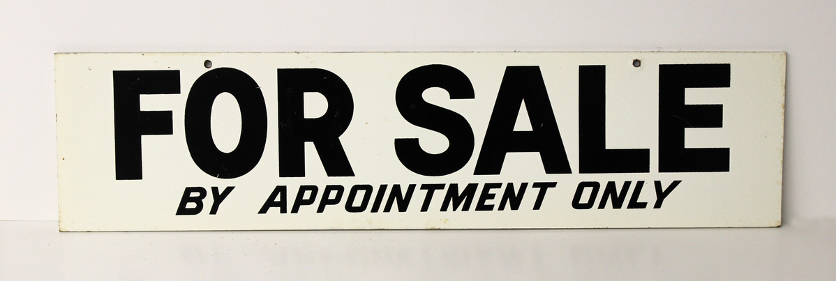 Rectangular sign used by Fahey Associates, Realtors of Litchfield, Connecticut. Painted wood sign with identical, double-sided decoration. White background with black text, "FOR SALE/BY APPOINTMENT ONLY." Two holes along top edge.