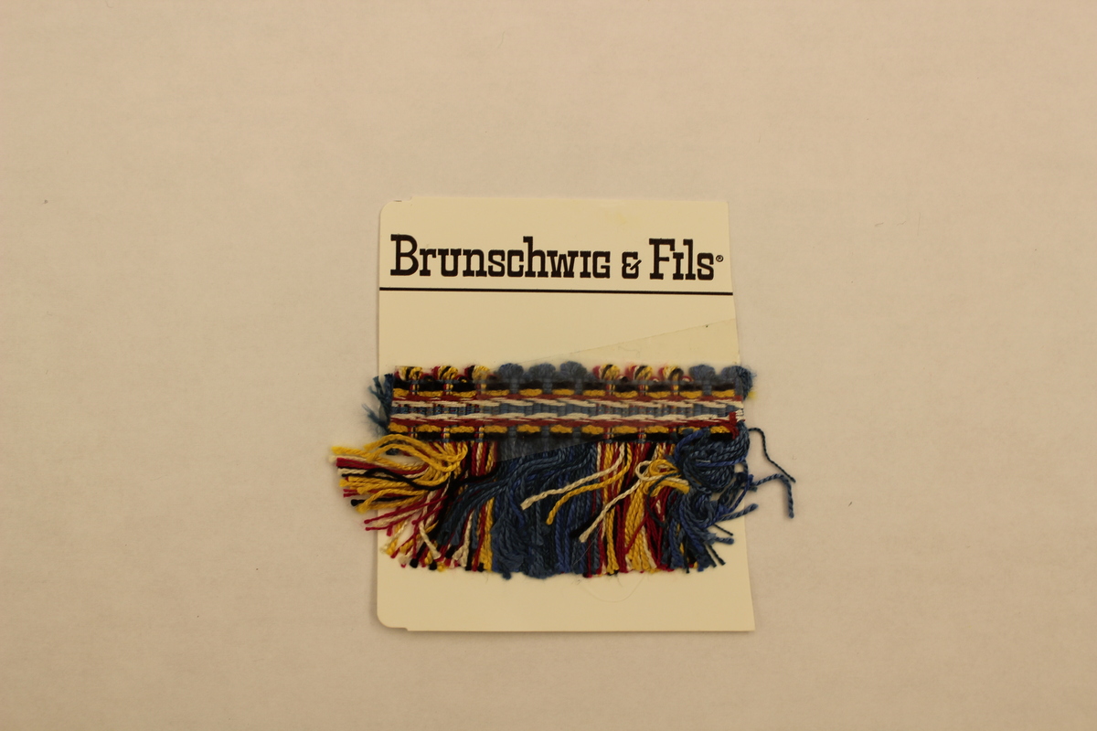 Strip of textile trim made of 85% viscose and 15% acrylic attached to card. Strip with a blue horizontal line down its middle. On the top and bottom of this line is a white line, pink line and then embroidered rectangles that are half yellow and half black. Fringe extends below the strip. Alternating color segments of fringe: one has yellow, pink, white and black thread and the other is blue. Three loops for each color segment of fringe extend at the top.