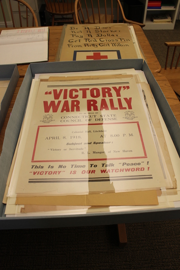 World War I era poster. White poster with red and black lettering. Poster reads, "'VICTORY'/ WAR RALLY/ TO BE HELD BY/ CONNECTICUT STATE/ COUNCIL OF DEFENSE/ Colonial Hall, Litchfield/ April 8, 1918/ AT 8:00 P.M./ Subject and Speaker: "Victory of Servitude"/ R.L. Munger, of New Haven/ This is no time to Talk "Peace"/ "Victory" IS OUR WATCHWORD!"