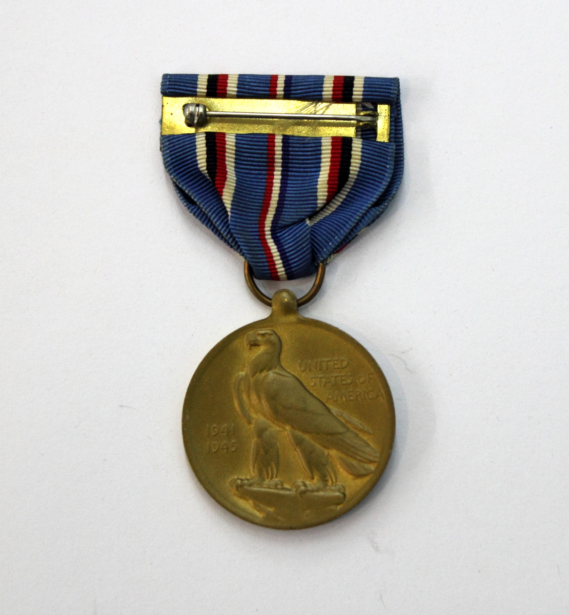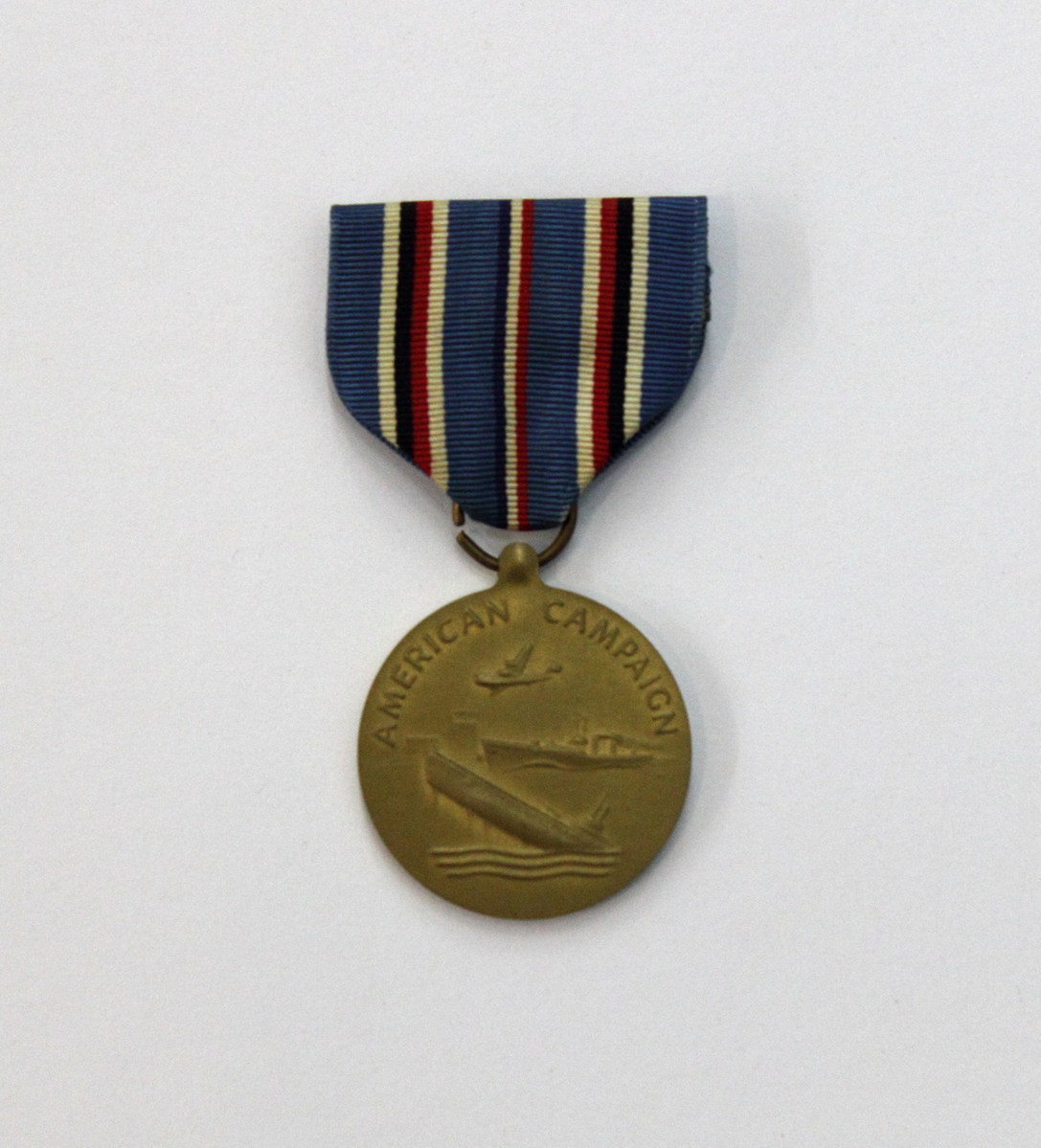Round bronze medal with silk ribbon and metal pin. Ribbon has blue background with three sets of bars colored white, red, black and dark blue running vertically. On obverse of medal, raised lettering along top curve reads "AMERICAN CAMPAIGN". Below lettering, relief of bomber flying above two building, a battleship, and a submarine. Below battleship small inscription "TJ". On reverse, relief of bald eagle standing on cliff. To the left of the eagle, lettering: "1941/1945" and to the right "'UNITED/STATES OF/AMERICA". At base of eagle, small inscription encircled letter "W". American Campaign Medal.