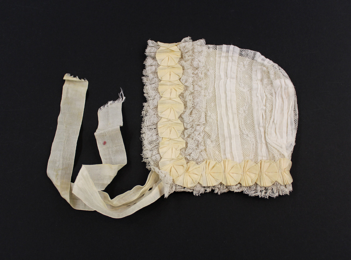 Off-white cotton child's bonnet; tucks and lace insertions; off-white silk ribbon rosettes at front and neck; ruffles at front and back; rounded section at back; lined with off-white silk; drawstrings at center back left side