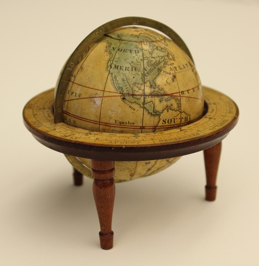 Five inch globe in stand. Wooden sphere with twelve printed gores and polar calottes. Maker's mark appears in Pacific Ocean. Continents of Europe, North America, and New Holland shaded in green with principal continents labeled. The stand sits on three legs and the horizon ring is printed with signs of the zodiac and calendar. Globe held in stand by brass meridian ring.
