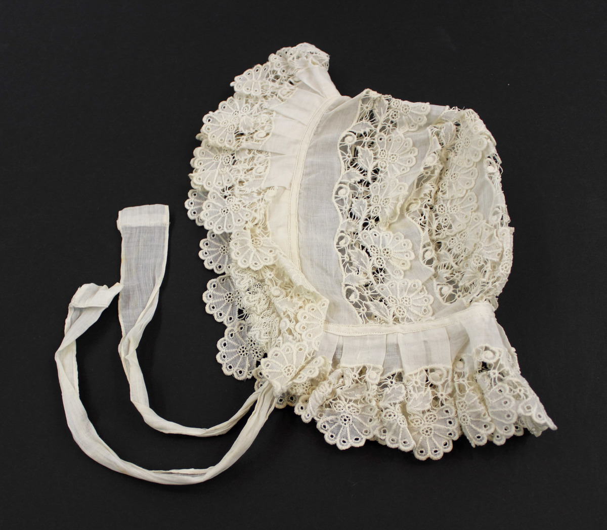 Off-white cotton child's bonnet; cut lace insertions and ruffles at front and neck; box pleated ruffle with lace at front; fabric ties