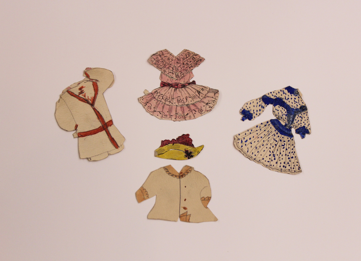 Box of assorted handmade and printer paper dolls and clothing items. The set contains one handmade boy doll, one handmade girl doll, two printed girl dolls cut from magazine or newspaper, five handmade suits or robes, seventeen handmade dresses, four handmade hats, one printed hat, and seven printed dresses. All of the handmade pieces are cut from a thick paper, like watercolor paper, and are decorated with pencil and watercolor. The printed pieces are also decorated with watercolor. The clothing pieces all have tabs for attaching them to a doll. Stored in a red, square box.