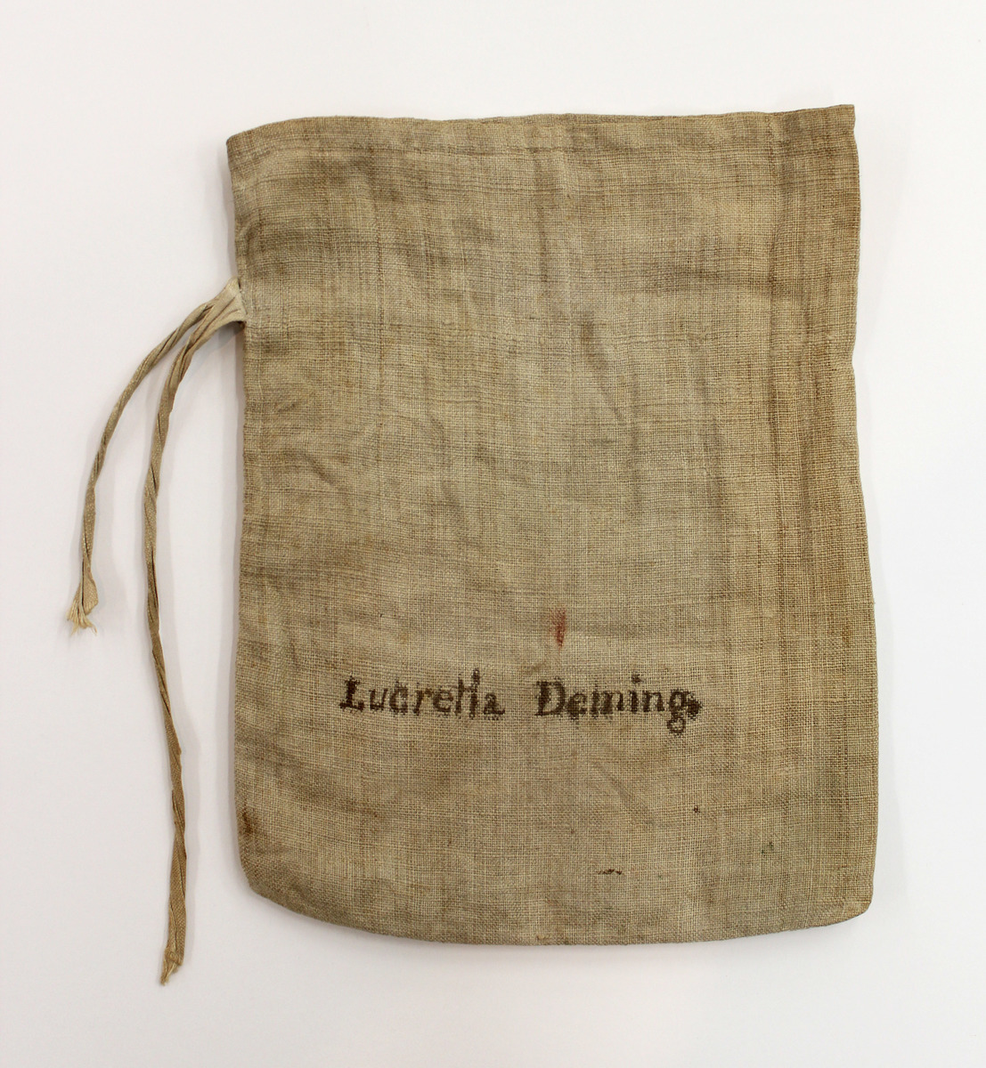 Tan bag of homespun linen. Flat with seams at bottom and along one side, hand-stitched hem at top. Linen tape ties attached at top-left. Hand lettering in dark brown ink, on front, "Lucretia Deming." Small repair with cotton patch completed at bottom of reverse.