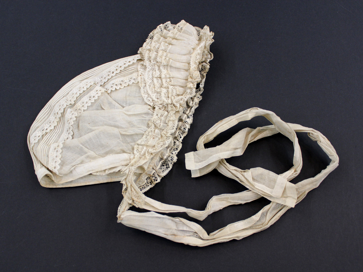 Off-white sheer cotton child's bonnet; ruffles and lace around front; rows of tucks and white work embroidered lace; short fabric band at chin attached on one side with illegible embroidery; fabric ties