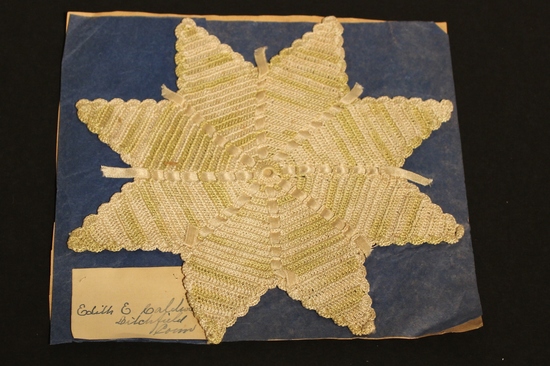 Eight-pointed star doily of crocheted ivory or pale green cotton yarns with ivory satin ribbons running from the center to the points. The doily is sewn to a piece of dark blue tissue and beige paper with 14 basting stitches. A paper label is sewn to the lower left corner of the blue tissues. It reads, "Edith E. Caldwell/ Litchfield/ Conn."
