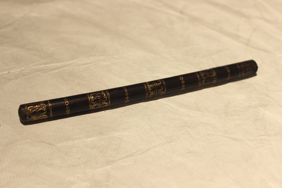 Tubular leather pencil holder with bands of gold decoration. Decoration matches that of embossed leather desk set marked "B. Altman & Co.," although the pencil holder is not marked. Thin layer of leather stretched over rigid cardboard/paperboard tube, with opening at one end.