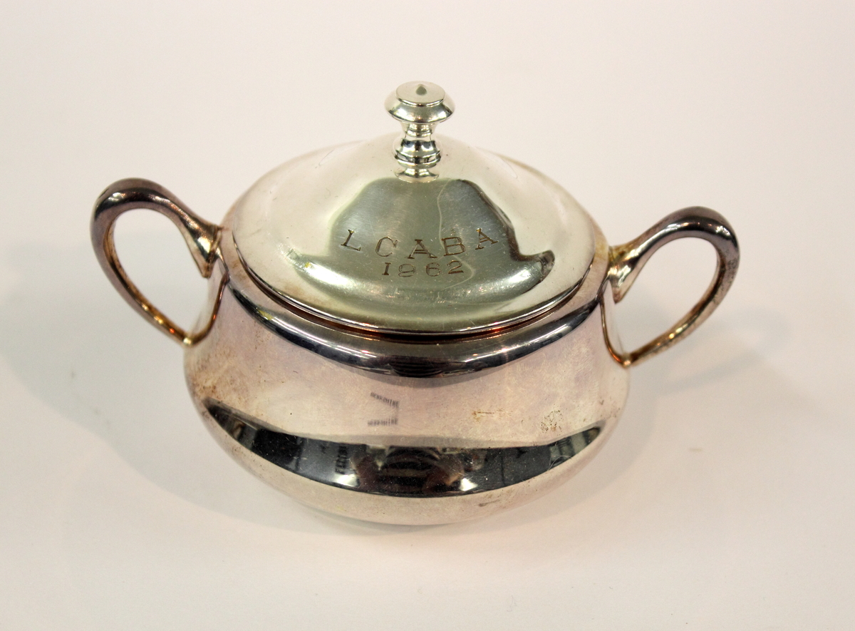 Sugar bowl given to Art Webster by the Litchfield County Agricultural Breeders Association. Silverplated sugar bowl with lid. Round, low-bellied bowl (a) with thin, rounded handle on each side. Marked on bottom in engraved text, "Crescent/52P" with images of lion's head, crescent moon, and bird's head. Round lid (b) with short, rounded handle. Engraved text on lid, "L.C.A.B.A./1962."