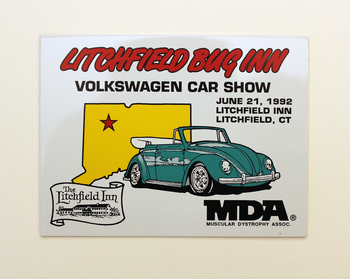 Rectangular plaque, aluminum with printer graphic on one side and adhesive sheet on reverse. White background with red lettering, "LITCHFIELD BUG IN," outlined in black. Below in black lettering, "VOLKSWAGEN CAR SHOW." Logo for the Litchfield Inn in the lower-left. At the center is a yellow outline of the state of Connecticut with a red star positioned over the town of Litchfield, with a teal convertible Volkswagen Beetle. Black lettering to the right, "JUNE 21, 1992/LITCHFIELD INN/LITCHFIELD, CT." At lower-right is the logo for the Muscular Dystrophy Association (MDA), presumably the beneficiary of the event.