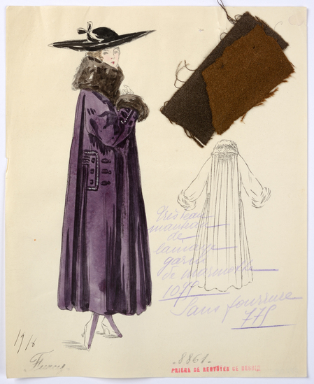 Lithograph and watercolor on paper fashion design. A coat of wool decorated with marmot fur. Fabric samples accompany rendering.