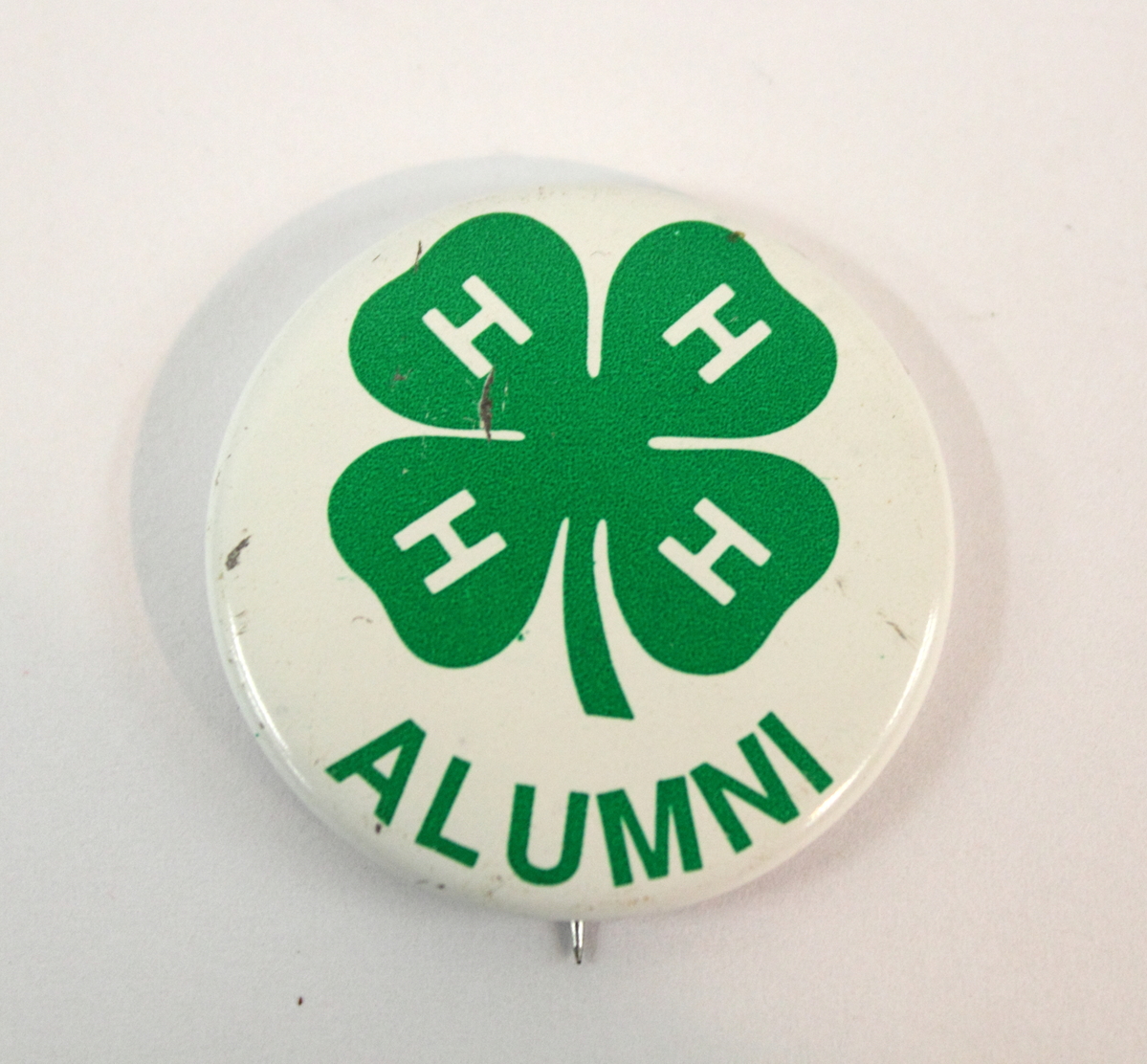 Round plastic and metal with button with straight metal pin. Button has white background. In center, image of green four-leaf clover with the white lettering "H" on each of the leaves. Below, green lettering "ALUMNI" runs along bottom edge of button.