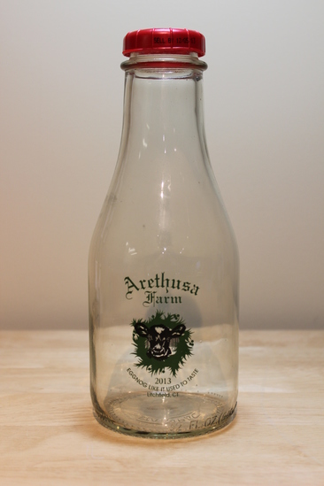 Three part mold glass milk bottle with red plastic milk cap. Cow head printed in black on bottle. Green wreath printed around cow head. "Arethusa Farm" printed in green above wreath. "2013/ Eggnog Like It Used To Taste/ Litchfield, CT" printed in green below wreath. "32 FL. OZ. (946ml)" impressed around bottom edge of bottle. "Stanpac" impressed in bottom of bottle. UPC code printed in black on back of bottle.