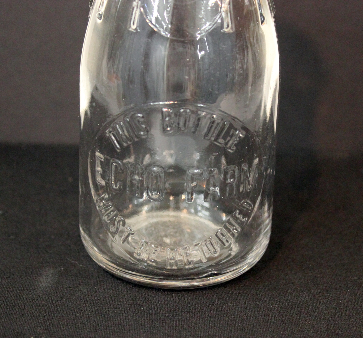 Glass milk bottle with round lip top, circular bottom, and tapered sides. Embossed lettering on front, "THIS BOTTLE/ECHO FARM/MUST BE RETURNED"; embossed lettering on back, "ONE PINT/LIQUID." Embossed lettering on bottom, "T MFG CO/7."