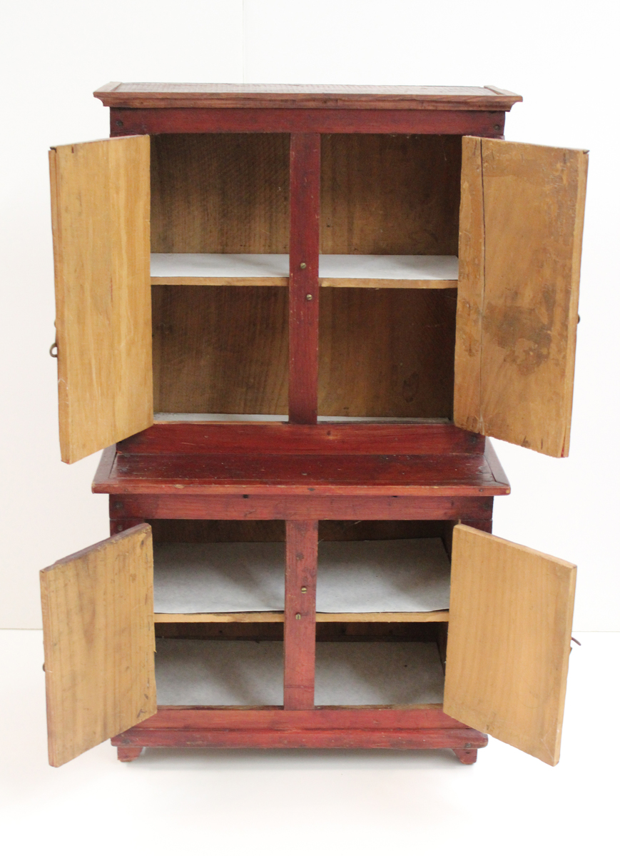 Small china cabinet or cupboard, possibly made to hold toy dishes or teaware. Simply designed and shaped like a chest-on-chest, but with solid-front wooden doors. Raised on four short legs with simple trim along bottom and molding along top. The top and bottom compartments each have two interior shelves and two hinged doors with hook latches. The front of the cabinet is stained a dark red, with the sides and back having a more natural stain. The interiors are unfinished.