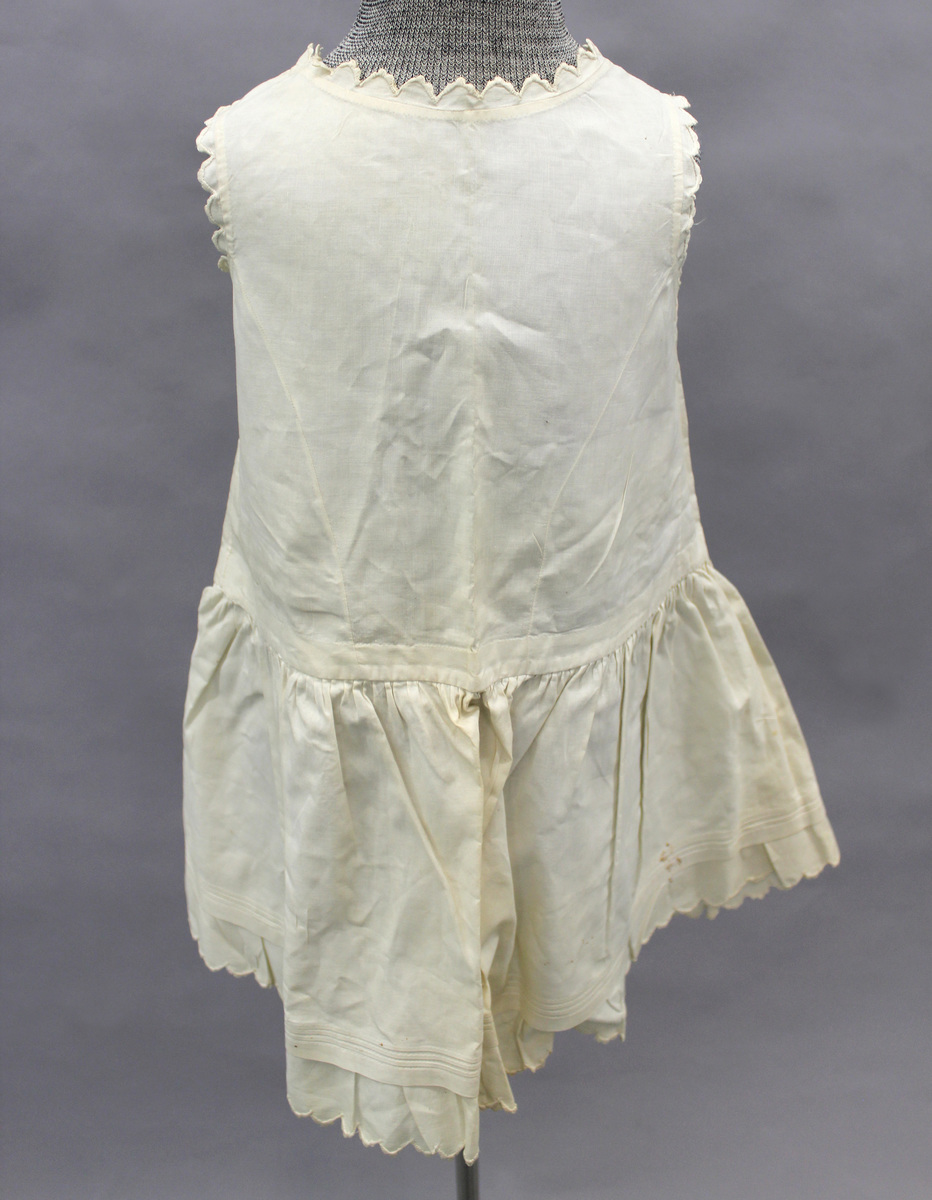 White cotton girl's full slip; dropped waist; round neckline with scalloped lace at neck and sleeve openings; center back opening with buttons; gathered skirt with multiple tucks and machine-made scalloped lace; princess seams on front bodice; all hand-stitched