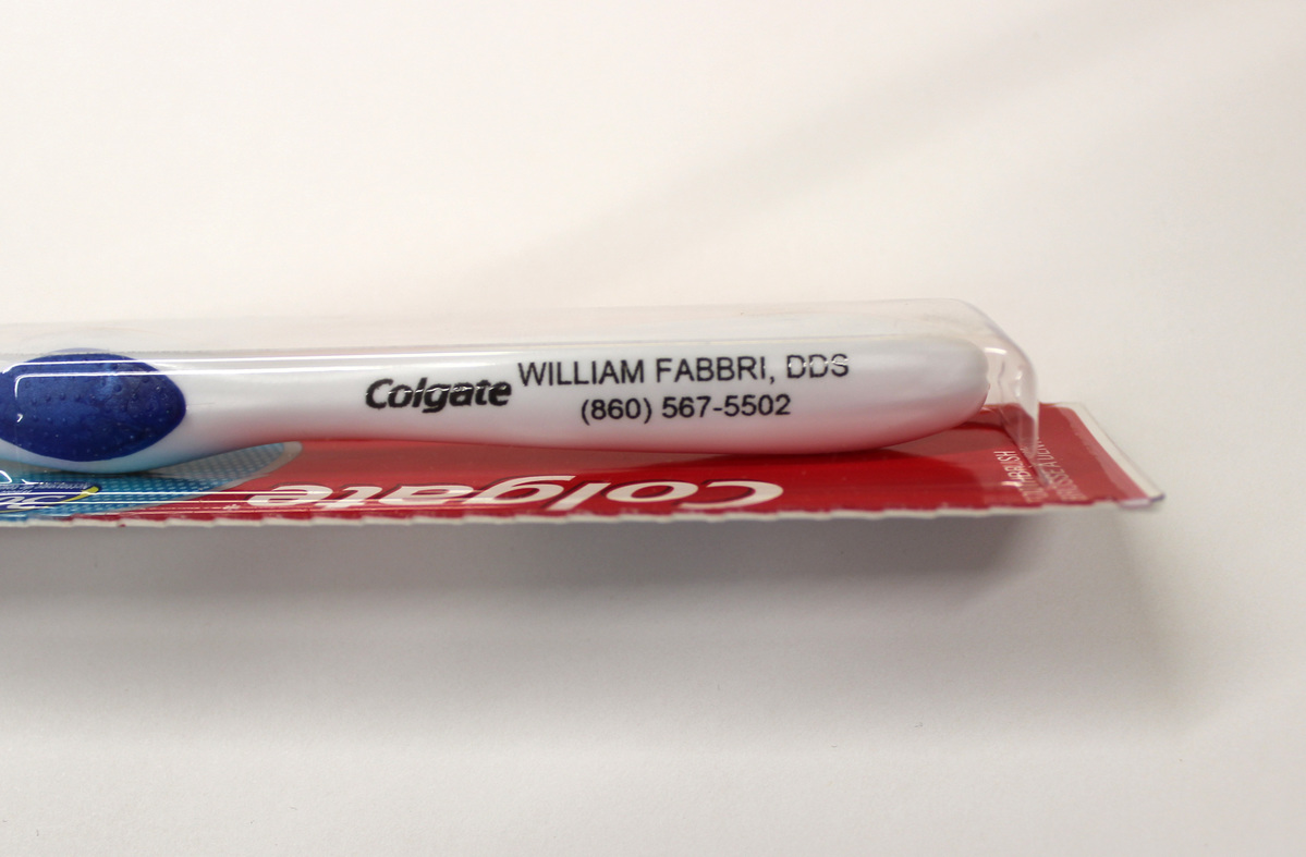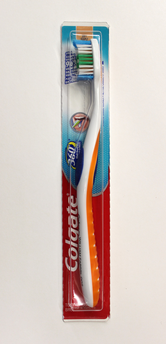 Plastic toothbrush given to patients at a dental practice in Litchfield. Colgate brand, still in packaging. Orange, white, and blue plastic. On handle, in black lettering, "WILLIAM FABBRI, DDS/(860) 567-5502."