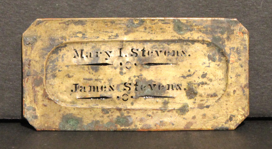Small rectangular nameplate painted gold with clipped corners. "Mary I. Stevens/ O/ James Stevens/ O" cut from center of nameplate. Backed in a black material that is visible through the cut out letters.