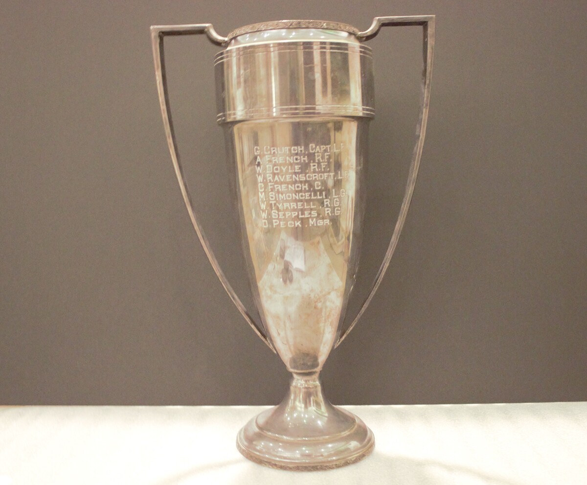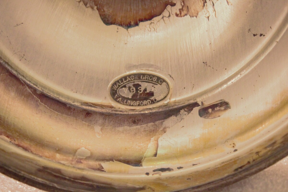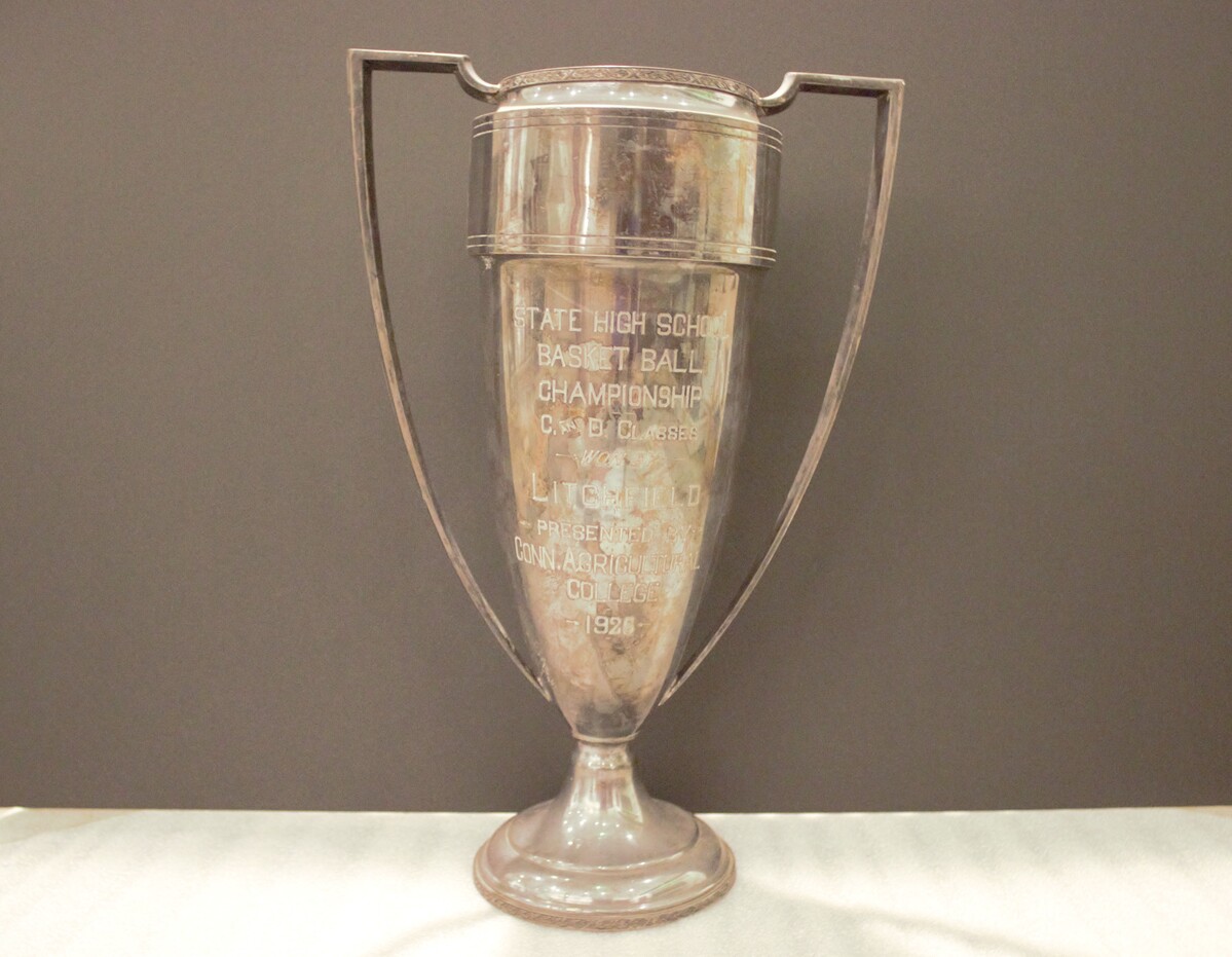 Metal goblet-style trophy for high school basketball awarded to Litchfield 1926. Engraved on front, "STATE HIGH SCHOOL / BASKET BALL / CHAMPIONSHIP / C. AND D. CLASSES / WON BY / LITCHFIELD / PRESENTED BY / CONN. AGRICULTURAL COLLEGE / 1926". Engraved on back, "G. CRUTCH, CAPT. L.F. / A. FRENCH, R.F. / W. DOYLE, R.F. / W. RAVENSCROFT, L.F. / C. FRENCH, C. / M. SIMONCELLI, L.G. / W. TYRRELL, R.G. / W. SEPPLES, R.G. / D. PECK, MGR." Maker's mark on bottom within a circle, "WALLACE GROS. CO. / V9316 / VALLINGFORD CONN".