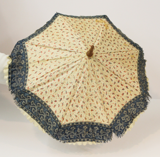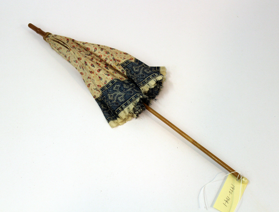 Parasol; small; printed silk with ivory ground with small red and blue paisley motifs; blue border.; bamboo (?) handle and ferrule; ivory tip at end of handle; lined in ivory silk; metal ribs